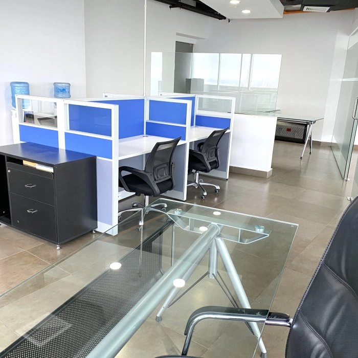 The office is fully furnished with elegant glass desks and confortable chairs. Granite floors, lamps, and bathroom mirrors. In addition, it has two work stations with cubicles and two parkings.